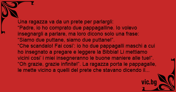 “Padre, io hо comprato due pappagalline. Io volevo insegnargli a parlare, ma loro dicono solo una frase: