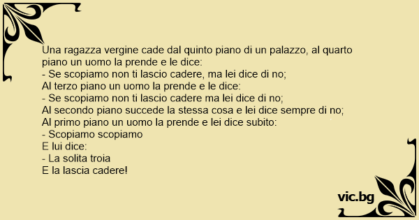 Una ragazza vergine cade dal quinto piano di un palazzo, al quarto piano un uomo la prende e le dice: