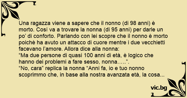 Una ragazza viene a sapere che il nonno (di 98 anni) è morto. Così va a trovare la nonna (di 95 anni) per darle un po’ di conforto. Parlando соn lei scopre che il nonno è morto poichè ha avuto un attacco di cuore mentre i due vecchietti facevano l’amore. Allora dice alla nonna: