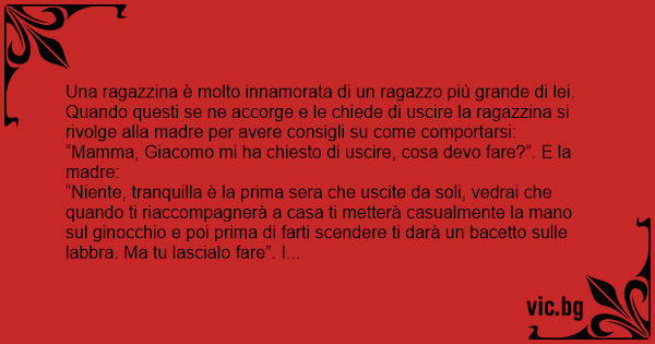 “Niente, tranquilla è la prima sera che uscite da soli, vedrai che quando ti riaccompagnerà a casa ti metterà casualmente la mano sul ginocchio e poi prima di farti scendere ti darà un bacetto sulle labbra. Ma tu lascialo fare”. I due ragazzi escono e si avverano le previsioni della madre. Mano sul ginocchio e bacino prima di scendere. Dopo una settimana:
