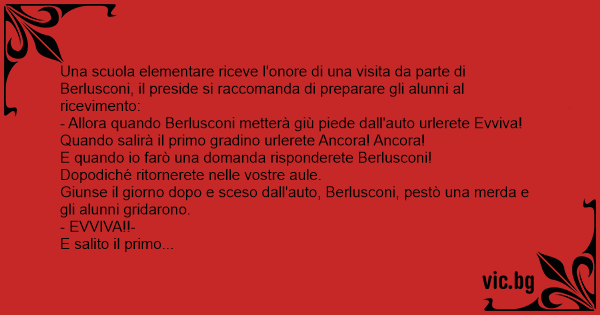 Una scuola elementare riceve l'onore di una visita da parte di Berlusconi, il preside si raccomanda di preparare gli alunni al ricevimento: - Allora quando Berlusconi metterà giù piede dall'auto urlerete Evviva! Quando salirà il primo gradino urlerete Ancora! Ancora! E quando io farò una domanda risponderete Berlusconi! Dopodiché ritornerete nelle vostre aule. Giunse il giorno dopo e sceso dall'auto, Berlusconi, pestò una меrdа e gli alunni gridarono. - EVVIVA!!- E salito il primo gradino la scarpa sporca lo fece scivolare rompendogli una costola e gli alunni reclamarono. - ANCORA!! ANCORA!! - Un alunno scorreggiò e il preside schifato domandò. - Chi è stato? - E gli alunni risposero. - BERLUSCONI!!-