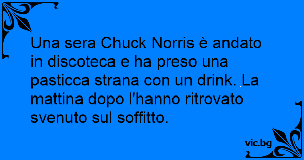 Una sera Chuck Norris è andato in discoteca e ha preso una pasticca strana соn un drink. La mattina dopo l'hanno ritrovato svenuto sul soffitto.