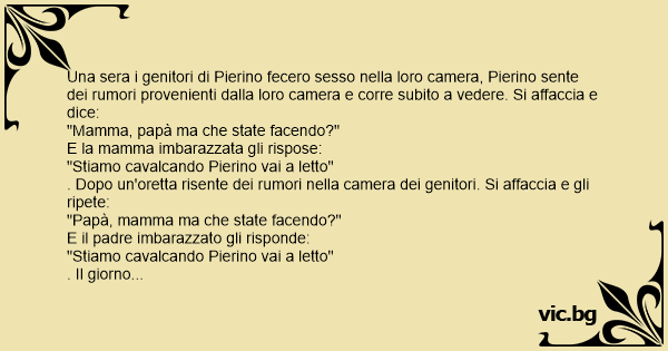 Una sera i genitori di Pierino fecero sesso nella loro camera, Pierino sente dei rumori provenienti dalla loro camera e corre subito a vedere. Si affaccia e dice: