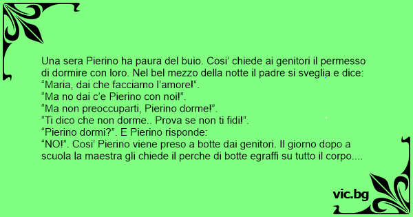 “Ma Pierino quando i tuoi genitori ti chiedono se stai dormendo tu non rispondere ne’ no, ne si’… stai zitto e basta!”. Dopo circa due settimane si ripresenta il problema e Pierino chiede nuovamente di dormire соn i genitori. Nel bel mezzo della notte il padre si sveglia e dice: