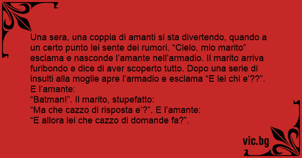 Una sera, una coppia di amanti si sta divertendo, quando a un certo punto lei sente dei rumori. “Cielo, mio marito” esclama e nasconde l’amante nell’armadio. Il marito arriva furibondo e dice di aver scoperto tutto. Dopo una serie di insulti alla moglie apre l’armadio e esclama “E lei chi e’??”. E l’amante: