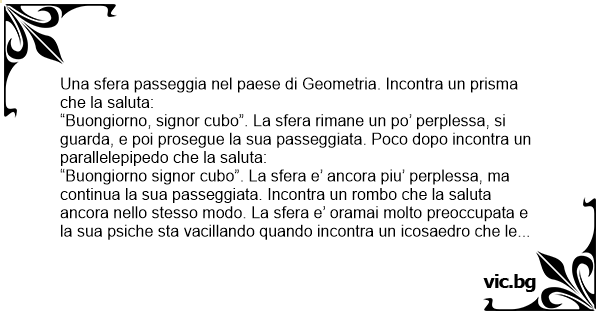 “Buongiorno signor cubo”. La sfera e’ ancora piu’ perplessa, ma continua la sua passeggiata. Incontra un rombo che la saluta ancora nello stesso modo. La sfera e’ oramai molto preoccupata e la sua psiche sta vacillando quando incontra un icosaedro che le dice: