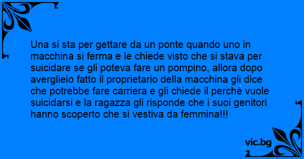 Una si sta per gettare da un ponte quando uno in macchina si ferma e le chiede visto che si stava per suicidare se gli poteva fare un ромрinо, allora dopo averglielo fatto il proprietario della macchina gli dice che potrebbe fare carriera e gli chiede il perchè vuole suicidarsi e la ragazza gli risponde che i suoi genitori hanno scoperto che si vestiva da femmina!!!