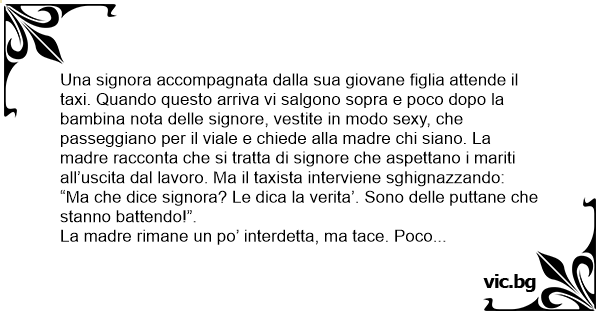 Un taxi avec une mère et son fils passe dans une rue avec des prostituées, et l'enfant demande: - Maman, maman, les dames elles font quoi là ? La mère répond: Elles attendent leur mari qui rentre...