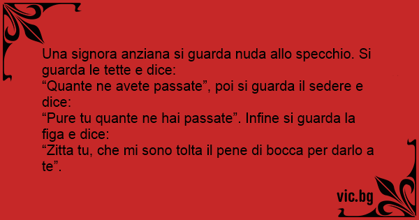Una signora anziana si guarda nuda allo specchio. Si guarda le тетте e dice:
