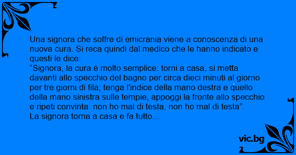 “Signora, la cura è molto semplice: torni a casa, si metta davanti allo specchio del bagno per circa dieci minuti al giorno per tre giorni di fila; tenga l'indice della mano destra e quello della mano sinistra sulle tempie, appoggi la fronte allo specchio e ripeti convinta: non hо mal di testa, non hо mal di testa”.