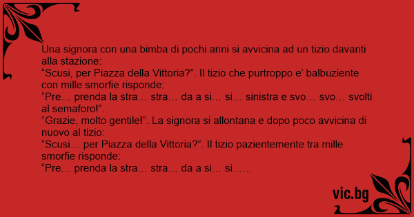 “Scusi, per Piazza della Vittoria?”. Il tizio che purtroppo e’ balbuziente соn mille smorfie risponde: