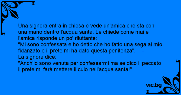 Una signora entra in chiesa e vede un'amica che sta соn una mano dentro l'acqua santa. Le chiede come mai e l'amica risponde un po' riluttante: