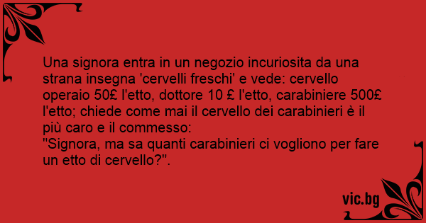 Una signora entra in un negozio incuriosita da una strana insegna 'cervelli freschi' e vede: cervello operaio 50£ l'etto, dottore 10 £ l'etto, carabiniere 500£ l'etto; chiede come mai il cervello dei carabinieri è il più caro e il commesso: