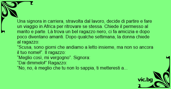Una signora in carriera, stravolta dal lavoro, decide di partire e fare un viaggio in Africa per ritrovare se stessa. Chiede il permesso al marito e parte. Là trova un bel ragazzo nero, ci fa amicizia e dopo poco diventano amanti. Dopo qualche settimana, la donna chiede al ragazzo: