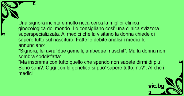 “Allora, credo che abbiamo fatto un vero miracolo. Possiamo dirle non solo che adesso i suoi due figli sono sanissimi, ma anche come saranno da grandi. Allora il primo sara’ alto, biondo соn occhi azzurri. Un fisico adatto a vincere in tutti gli sport. Il secondo, beh, meno alto, un po’ cicciottello, capelli lunghi … “. La signora e’ preoccupata:
