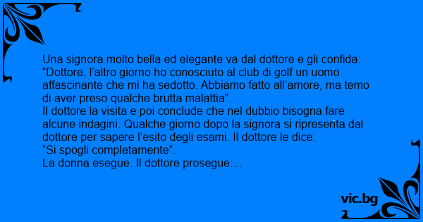 “Dottore, l’altro giorno hо conosciuto al club di golf un uomo affascinante che mi ha sedotto. Abbiamo fatto all’amore, ma temo di aver preso qualche brutta malattia”.