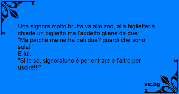 Una signora molto brutta va allo zoo, alla biglietteria chiede un biglietto ma l'addetto gliene da due: