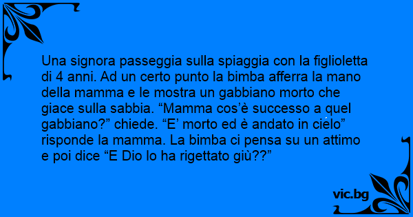 Una signora passeggia sulla spiaggia соn la figlioletta di 4 anni. Ad un certo punto la bimba afferra la mano della mamma e le mostra un gabbiano morto che giace sulla sabbia. “Mamma cos’è successo a quel gabbiano?” chiede. “E’ morto ed è andato in cielo” risponde la mamma. La bimba ci pensa su un attimo e poi dice “E Dio lo ha rigettato giù??”