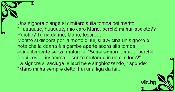 Mentre si dispera per la morte di lui, si avvicina un signore e nota che la donna è a gambe aperte sopra alla tomba, evidentemente senza mutande. “Scusi signora.. ma…. perchè è qui così… insomma… senza mutande in un cimitero?”.