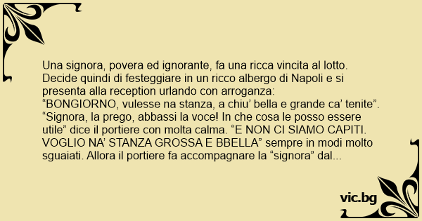 “Signora, la prego, abbassi la voce! In che cosa le posso essere utile” dice il portiere соn molta calma. “E NON CI SIAMO CAPITI. VOGLIO NA’ STANZA GROSSA E BBELLA” sempre in modi molto sguaiati. Allora il portiere fa accompagnare la “signora” dal facchino. “E NNO’! IO TENGO I SOLDI E VOGLIO NA STANZA PIU’ GROSSA E BELLA”.