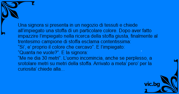 Una signora si presenta in un negozio di tessuti e chiede all’impiegato una stoffa di un particolare colore. Dopo aver fatto impazzire l’impiegato nella ricerca della stoffa giusta, finalmente al trentesimo campione di stoffa esclama contentissima: