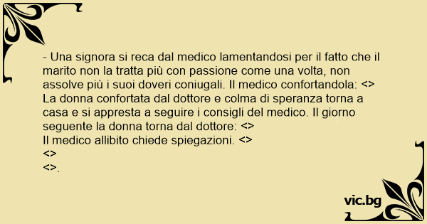 - Una signora si reca dal medico lamentandosi per il fatto che il marito non la tratta più соn passione come una volta, non assolve più i suoi doveri coniugali. Il medico confortandola: <>
