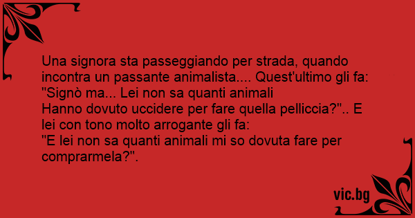 Una signora sta passeggiando per strada, quando incontra un passante animalista.... Quest'ultimo gli fa: