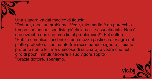 “Beh, è semplice: lei sbricioli una mezza pasticca di Viаgrа nel piatto preferito di suo marito (mi raccomando, signora, il piatto preferito non è lei, ma qualcosa di cucinato) e vedrà che nel giro di pochi minuti ritroverà il suo vigore sopito”.
