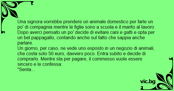 "Senta Signora, devo pero dirle una cosa imbarazzante... Sa, non e un caso che il pappagallo costi cosi poco... Il motivo è perché ha vissuto fino ad ora in una casa di appuntamenti".
