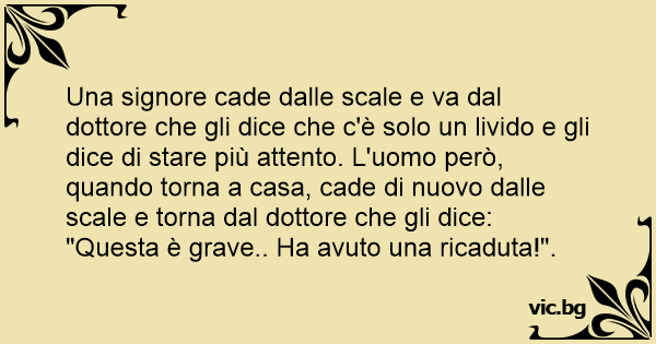 Una signore cade dalle scale e va dal dottore che gli dice che c'è solo un livido e gli dice di stare più attento. L'uomo però, quando torna a casa, cade di nuovo dalle scale e torna dal dottore che gli dice: