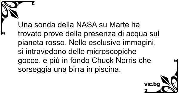 Una sonda della NASA su Marte ha trovato prove della presenza di acqua sul pianeta rosso. Nelle esclusive immagini, si intravedono delle microscopiche gocce, e più in fondo Chuck Norris che sorseggia una birra in piscina.