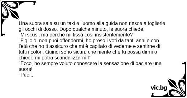 C'est une bonne sœur qui monte dans un taxi. Le chauffeur n'arrête pas de la dévisager dans son rétroviseur. Cette dernière ayant remarqué son regard insistant lui demande ce qui le préoccupe. Le taxi lui avoue : - À chaque fois que je croise une bonne sœur j'ai toujours envie de l'embrasser mais...