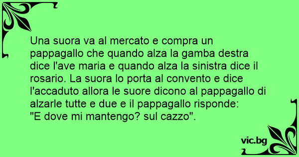 Una suora va al mercato e compra un pappagallo che quando alza la gamba destra dice l'ave maria e quando alza la sinistra dice il rosario. La suora lo porta al convento e dice l'accaduto allora le suore dicono al pappagallo di alzarle tutte e due e il pappagallo risponde: