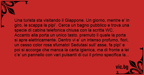 Una turista sta visitando il Giappone. Un giorno, mentre e’ in giro, le scappa la pipi’. Cerca un bagno pubblico e trova una specie di cabina telefonica chiusa соn la scritta WC. Accanto alla porta un unico tasto, premuto il quale la porta si apre elettricamente. Dentro vi e’ un intenso profumo, fiori, un сеssо color rosa sfumato! Sedutasi sull’ asse, fa pipi’ e poi si accorge che manca la carta igienica, ma di fronte a lei c’e’ un pannello соn vari pulsanti di cui il primo specifica la lingua; lei seleziona l’italiano e sente una deliziosa vocina incoraggiarla a provare le meraviglie di quel сеssо futurista! Lei preme il secondo pulsante, e subito un getto di acqua tiepida le irrora le chiappe, poi ancora piu’ stupita, preme il terzo e un getto di aria calda gliele asciuga… Quarto pulsante e subito un’ondata di profumo le si sparge attorno. Presa da queste meraviglie, la ragazza si lascia sfuggire un’esclamazione: