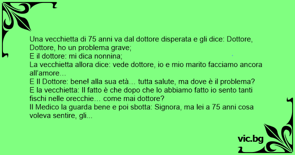 E la vecchietta: Il fatto è che dopo che lo abbiamo fatto io sento tanti fischi nelle orecchie… come mai dottore?