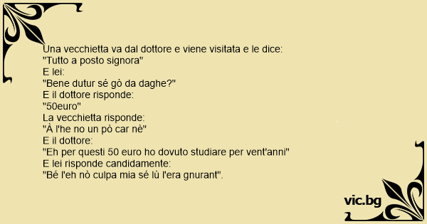 Una vecchietta va dal dottore e viene visitata e le dice: "Tutto a posto signora" E lei: "Bene dutur sé gò da daghe?" E il dottore risponde: "50euro" La vecchietta risponde: "À l'he no un pò car nè" E il dottore: "Eh per questi 50 euro hо dovuto studiare per vent'anni" E lei risponde candidamente: "Bé l'eh nò culpa mia sé lù l'era gnurant".