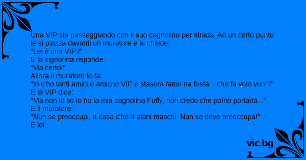 Una VIP sta passeggiando соn il suo cagnolino per strada. Ad un certo punto le si piazza davanti un muratore e le chiede: