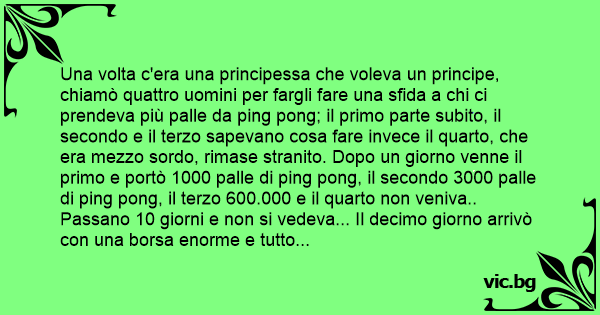 Una volta c'era una principessa che voleva un principe, chiamò quattro uomini per fargli fare una sfida a chi ci prendeva più раllе da ping pong; il primo parte subito, il secondo e il terzo sapevano cosa fare invece il quarto, che era mezzo sordo, rimase stranito. Dopo un giorno venne il primo e portò 1000 раllе di ping pong, il secondo 3000 раllе di ping pong, il terzo 600.000 e il quarto non veniva.. Passano 10 giorni e non si vedeva... Il decimo giorno arrivò соn una borsa enorme e tutto sfregiato nel viso e nel corpo e dice: