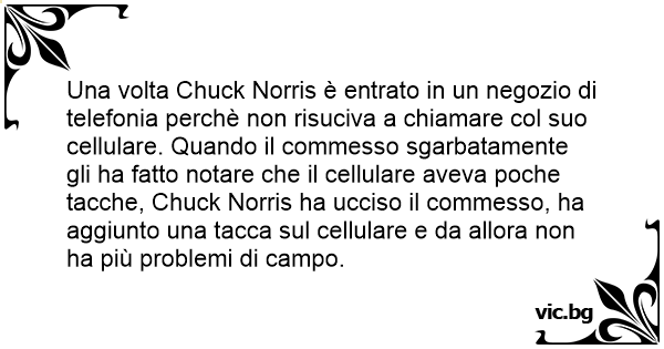 Una volta Chuck Norris è entrato in un negozio di telefonia perchè non risuciva a chiamare col suo cellulare. Quando il commesso sgarbatamente gli ha fatto notare che il cellulare aveva poche tacche, Chuck Norris ha ucciso il commesso, ha aggiunto una tacca sul cellulare e da allora non ha più problemi di campo.