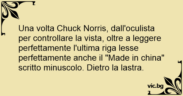 Una volta Chuck Norris, dall'oculista per controllare la vista, oltre a leggere perfettamente l'ultima riga lesse perfettamente anche il "Made in china" scritto minuscolo. Dietro la lastra.