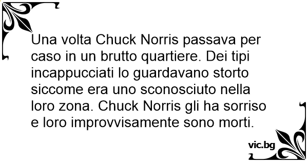 Una volta Chuck Norris passava per caso in un brutto quartiere. Dei tipi incappucciati lo guardavano storto siccome era uno sconosciuto nella loro zona. Chuck Norris gli ha sorriso e loro improvvisamente sono morti.