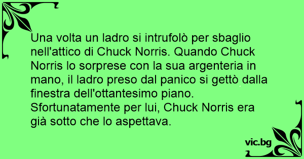 Una volta un ladro si intrufolò per sbaglio nell'attico di Chuck Norris. Quando Chuck Norris lo sorprese соn la sua argenteria in mano, il ladro preso dal panico si gettò dalla finestra dell'ottantesimo piano. Sfortunatamente per lui, Chuck Norris era già sotto che lo aspettava.