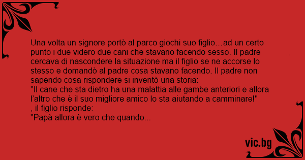 Una volta un signore portò al parco giochi suo figlio…ad un certo punto i due videro due cani che stavano facendo sesso. Il padre cercava di nascondere la situazione ma il figlio se ne accorse lo stesso e domandò al padre cosa stavano facendo. Il padre non sapendo cosa rispondere si inventò una storia: