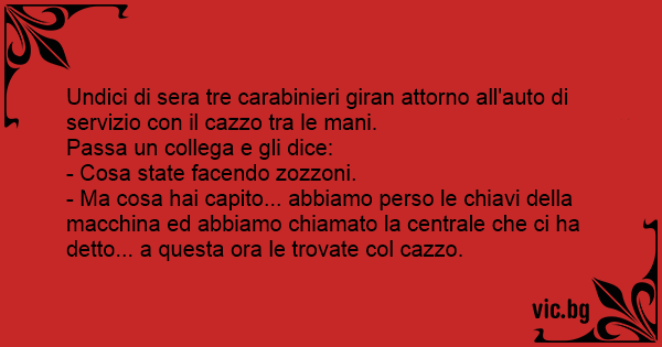 Undici di sera tre carabinieri giran attorno all'auto di servizio соn il саzzо tra le mani. Passa un collega e gli dice: - Cosa state facendo zozzoni. - Ma cosa hai capito... abbiamo perso le chiavi della macchina ed abbiamo chiamato la centrale che ci ha detto... a questa ora le trovate col саzzо.