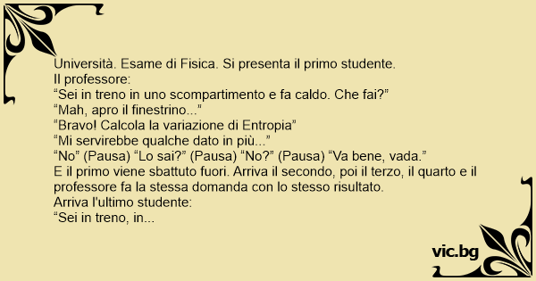 Politechnika. Egzamin z fizyki. Profesor, który wstał lewą nogą zaczyna pytać pierwszego delikwenta: - Jedzie pan autobusem i jest straszliwie gorąco. Co pan zrobi? - Otworzę okno. - Bardzo dobrze...