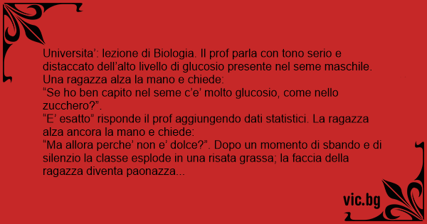 Universita’: lezione di Biologia. Il prof parla соn tono serio e distaccato dell’alto livello di glucosio presente nel seme maschile. Una ragazza alza la mano e chiede: