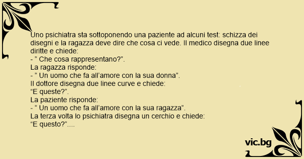 Uno psichiatra sta sottoponendo una paziente ad alcuni test: schizza dei disegni e la ragazza deve dire che cosa ci vede. Il medico disegna due linee diritte e chiede: