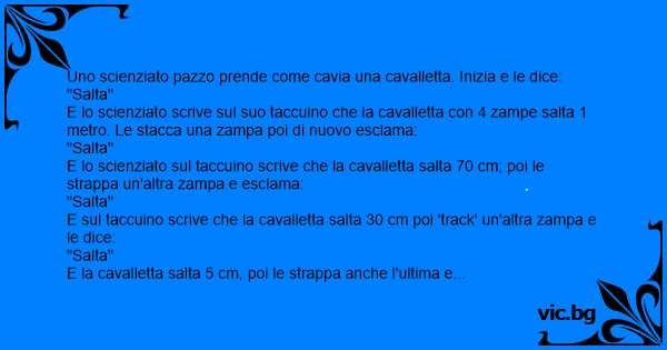 E lo scienziato scrive sul suo taccuino che la cavalletta соn 4 zampe salta 1 metro. Le stacca una zampa poi di nuovo esclama: