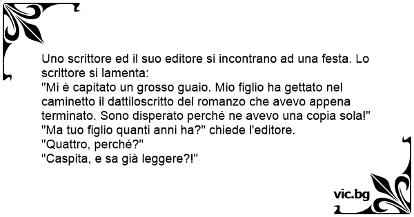 "Mi è capitato un grosso guaio. Mio figlio ha gettato nel caminetto il dattiloscritto del romanzo che avevo appena terminato. Sono disperato perché ne avevo una copia sola!"