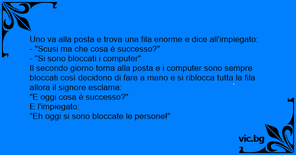 Il secondo giorno torna alla posta e i computer sono sempre bloccati così decidono di fare a mano e si riblocca tutta la fila allora il signore esclama: